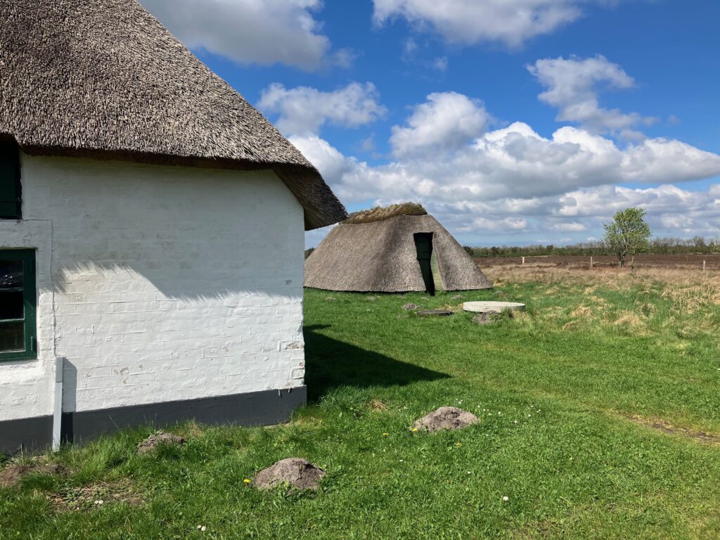 «Helenes Hus» in der Nähe der Stadt Herning ist eines der übriggebliebenen Häuser einer kleinen Siedlung, wohin Menschen verbannt wurden. Heute ist es ein kleines Museum – und ein Kraftort. Das Bild zeigt Helenes Hus links und eine rekonstruierte Hütte, die verschiedenen Zwecken dient, im Hintergrund. (Foto Radgenossenschaft)