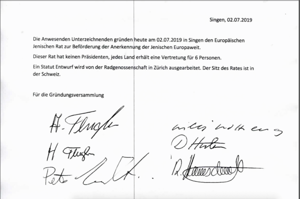 Die Gründungserklärung des Europäischen Jenischen Rates von 2019, mittlerweile ein historisches Dokument. (Unten)