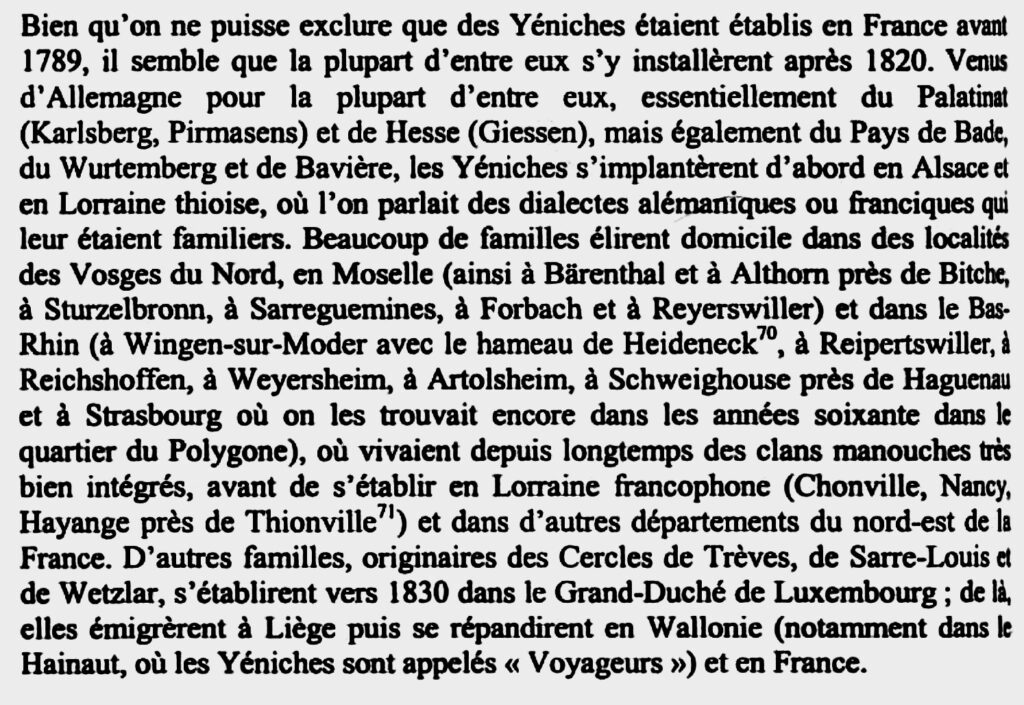 Ein Abschnitt über Frankreichs Jenische aus dem lesenswerten Buch von Christian Bader. (Quelle Christian Bader: «Yéniches: Les derniers nomades d’Europe: Suivi d’un lexique yéniche-français et français-yéniche». Paris, L’Harmattan, 2007, ISBN 978-2-296-03675-8)