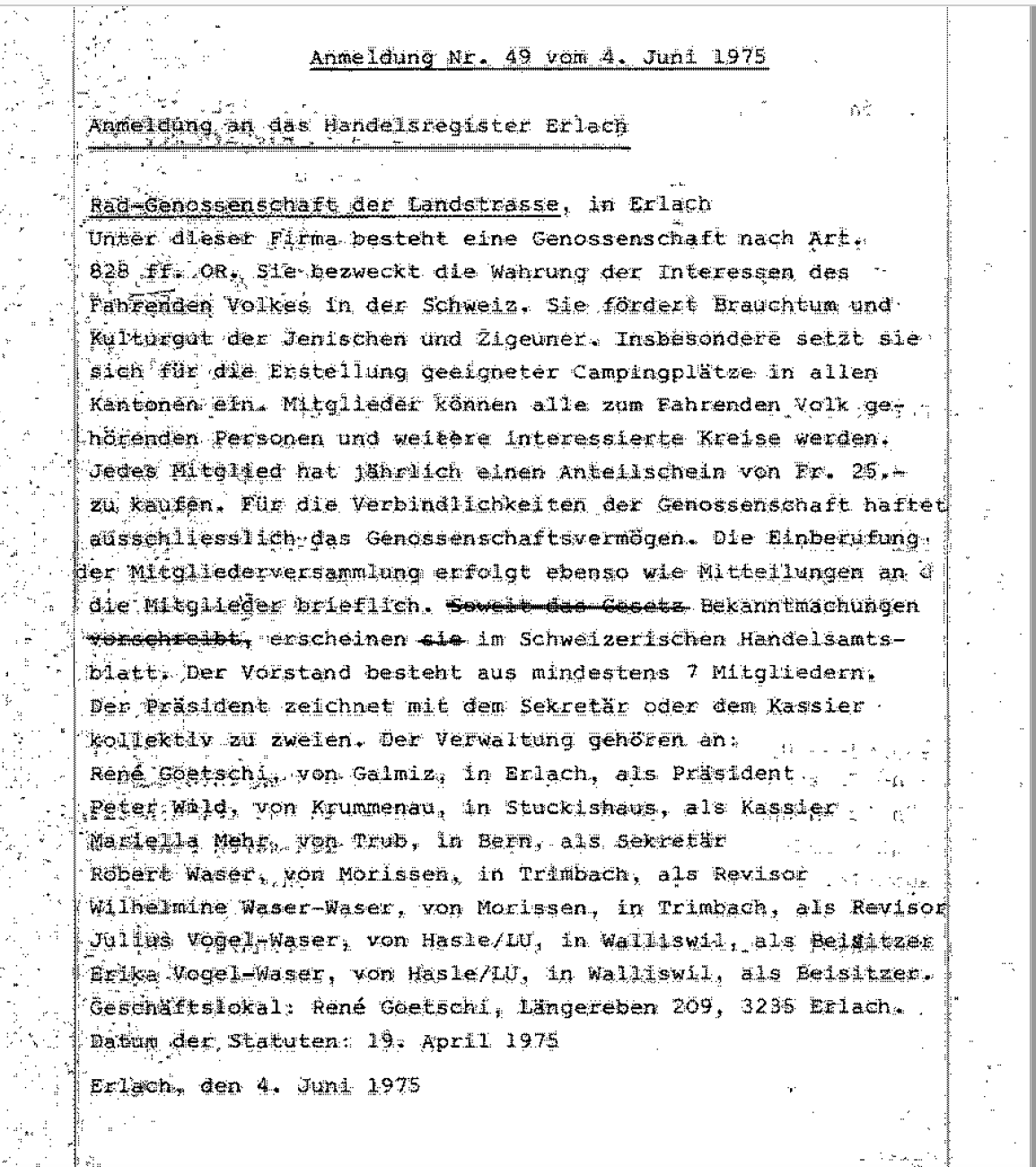 • Dokument, Anmeldung der Radgenossenschaft im Handelsregister 1975 Der erste Eintrag im Handelsregisteramt, vom 4. Juni 1953.