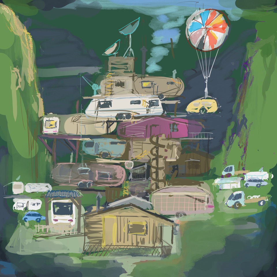 Bild unten: Der Staat erfüllt seine Pflicht nicht, die Jenischen haben keinen Raum. – Das erste Hochhaus auf einem jenischen Halteplatz. (Vision von Willi Wottreng, auf dem iPad gemalt).